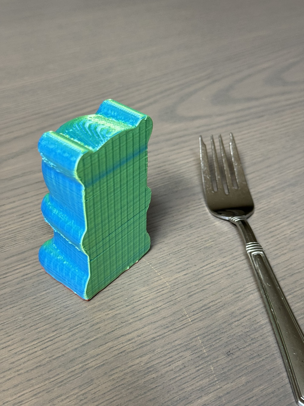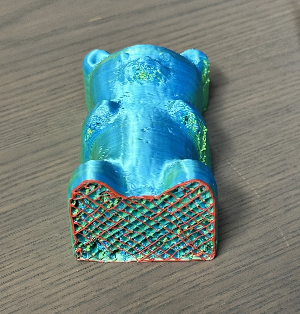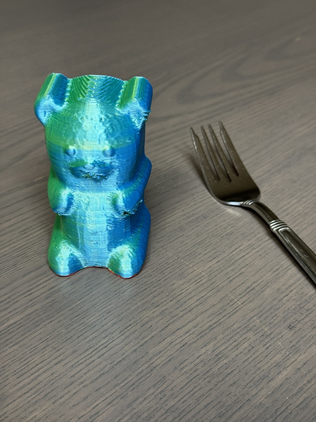 This 3D printed Gummy Bear is big and fun. It measures 3.25in tall by 2in wide by 1.5in deep, and is printed using special two-color filament that creates a blue and green shine!